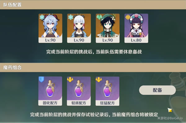 输出方法:甘雨Q>温迪Q>神里Q(循环) <第三阶层·强化样本>队伍+魔药配置参考(这里我把强力的魔药用了,别学我)