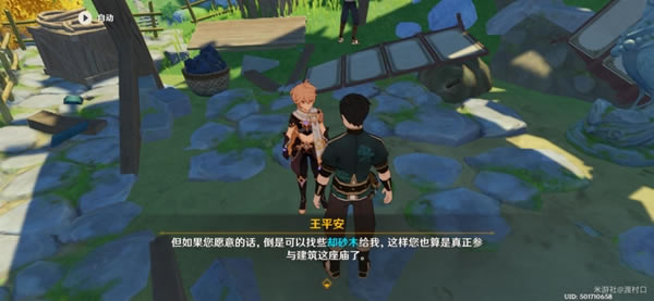 2.清除完盗宝团后回到铜雀庙,王平安为了让你有参与感,请你送给他12块却砂木。