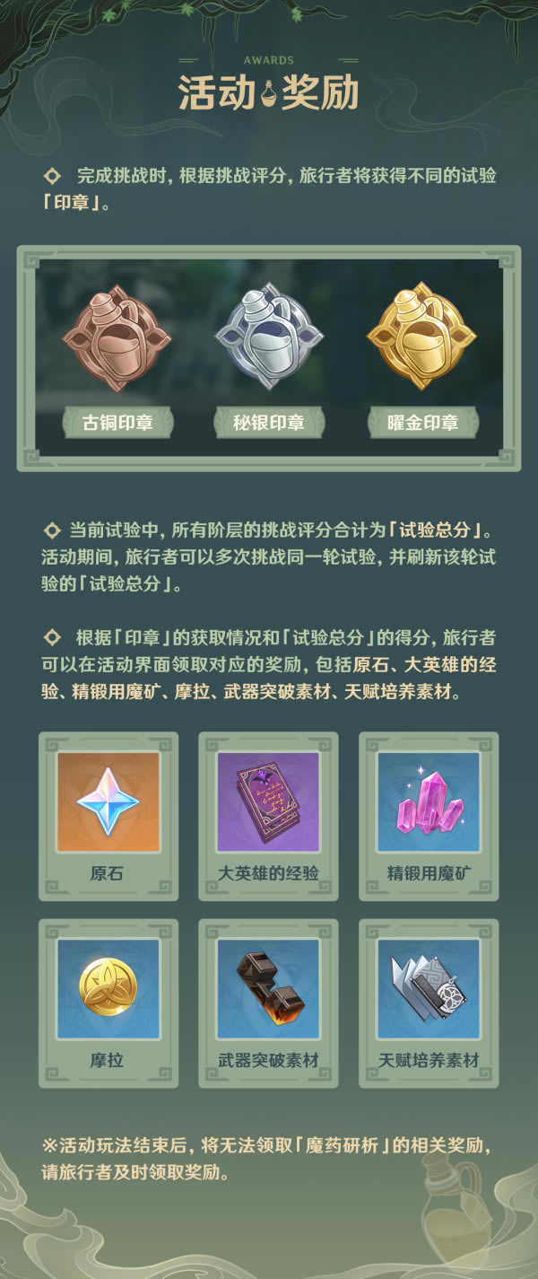 《原神》是由上海米哈游网络科技股份有限公司制作发行的一款开放世界冒险游戏,于2017年1月底立项,原初测试于2019年6月21日开启,再临测试于2020年3月19日开启,启程测试于2020年6月11日开启,PC版技术性开放测试于9月15日开启,公测于2020年9月28日开启。 原神魔药研析活动即将开启,部分玩家可能还不清楚怎么玩,下面一起来看看原神魔药研析玩法详解吧。 原神魔药研析玩法详解 「魔药研析」活动即将开启。蒙德的炼金术士蒂玛乌斯正在试制某种传说中的炼金药剂,帮助蒂玛乌斯完成这项研究,似乎能获取丰厚的报酬...