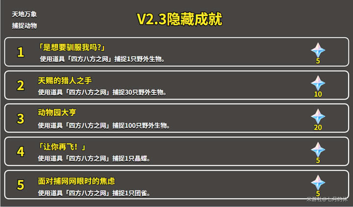 《原神》是由上海米哈游网络科技股份有限公司制作发行的一款开放世界冒险游戏,于2017年1月底立项,原初测试于2019年6月21日开启,再临测试于2020年3月19日开启,启程测试于2020年6月11日开启,PC版技术性开放测试于9月15日开启,公测于2020年9月28日开启。 原神2.3版本新增了多个隐藏成就,部分玩家可能还不清楚隐藏成就有哪些,下面一起来看看原神2.3隐藏成就汇总吧。 原神2.3隐藏成就汇总 2.3版本新增11成就,其中9个是【隐藏成就】,2个是显示成就,共可获得105原石! 捕捉动物类【隐藏成就】共5个 需要【四方八方之网】的世界任务,每周可以在npc「若紫」购买5个【四方八方之网】,每周一04:00刷新。 装备【四方八方之网】即可捕捉大世界里的大部分动物,并可以把捕捉到的动物当成【摆设】放置到尘歌壶里,完成特定条件即可获得【隐藏成就】。 >>全动物捕捉位置攻略传送门