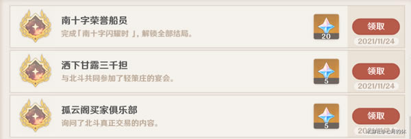 (北斗) 【孤云阁买家俱乐部】+【洒下甘露三千担】为隐藏成就, 解锁5个结局,获得显示成就【南十字荣誉船员】。