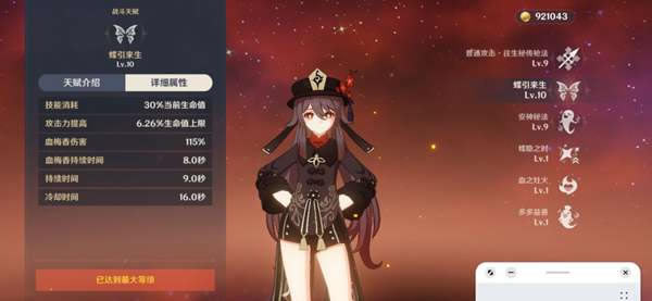 满血胡桃在精1护摩的加成上 吃药后增加了3888点生命值 攻击力增加823-792=31点 半血下的胡桃面板