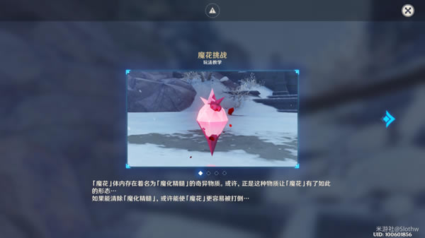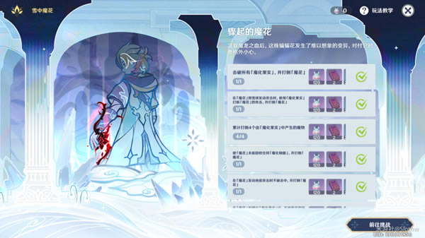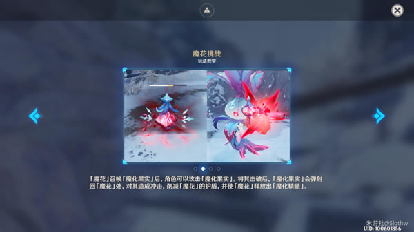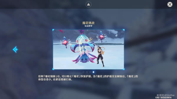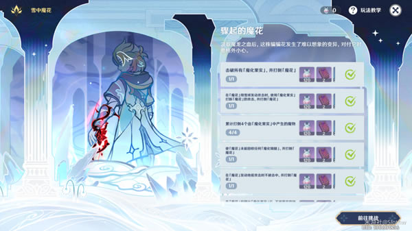 三、挑战任务详解 PS:打不过怎么办?那当然是……摇人啦 1、击破所有「魔化果实」,并打倒「魔花」 魔花有三个「魔化果实」,一次挑战中击破三个「魔化果实」在打倒「魔花」即可 2、在「魔花」用雪球发动攻击时,使用「魔化果实」打断「魔花」的攻击,并打倒「魔花」 顾名思义在「魔花」用雪球发动攻击时,击破「魔化果实」就可以打断「魔花」的攻击 3、累计打倒4个由「魔化果实」中产生的魔物 第三个「魔化果实」会产生大冰史莱姆,要是想一次挑战完成的话可以先不急着击破第三个「魔化果实」,等他产生了四个冰史莱姆后击败即可 4、使「魔花」未能回收任何「魔化精髓」,并打倒「魔花」 在「魔花」护盾消失前捡走每一个「魔化精髓」,注意拾取「魔化精髓』后,在场上角色会在一段时间内持续损失生命值,注意血量别挂了,可以切人抗伤害(最好带个奶)。 5、在「魔花』发动地底攻击时不被击中,并打倒「魔花」 等「魔花」变小后跑远一点它就会发动地底攻击(有前摇),躲过去即可。 6、在「魔花]投掷出「魔化果实」后,不被果实的锤击击中,并打倒「魔花」 「魔花]投掷出「魔化果实」会从空中锤击,别被锤中。