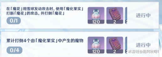 该批次任务攻略核心是等。 等什么呢, 等大骗骗花扔雪球的时候击破魔化果实; 等大骗骗花飞出的魔化果实产生魔物,并打倒4个产生的魔物,此任务可以分批次完成,打倒数量足够后,不需要杀死大骗骗花,可以直接退,不影响任务结算。 本次分享游戏《原神》攻略。 |