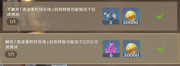 任务步骤 任务对话部分是流程,大家自己做就行。 关键是对战部分,流程是这样的: 1、开启挑战 2、雷元素点亮柱子,柱子充能(一次就可以点亮,充能速度也最快,慢慢越来越慢) 3、充能完成的前提下,再打败遗迹,否则遗迹会加血 4、充能中会来怪物,两个开始充能,遗迹重机+攻击,三个开始充能遗迹重机+防御 如何瘫痪遗迹重机在最后!! 完成步骤 这6个奖励,至少要分两次才能完成。 先做简单的,一次性完成,拿四个:
