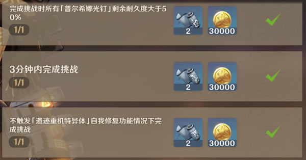 这四个就是狂输出模式,简单的说: 1、换上最强力角色(记得一定要带雷元素,推荐弓箭雷),开启挑战 2、激活三个雷柱子,都开始充能 3、然后就是疯狂对遗迹重机输出,就好了。 其他注意点: 1、一定要带弓箭,中间重机会对柱子射激光,会狂掉血,只能把他打瘫痪。 2、中间会有其他怪物随机刷新打雷柱子,也要打死 3、注意一定是先充能完成,再秒掉遗迹重机最后一丝血!!! 剩下两个奖励,花费时间长一点