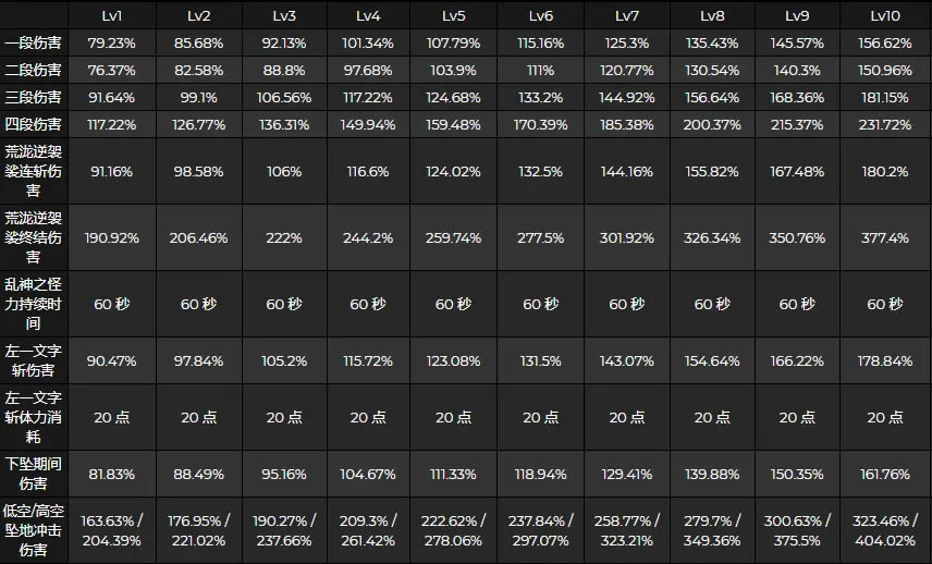 荒泷一斗 普通攻击1-10级倍率 荒泷一斗普通攻击Lv10循环倍率:720.45% 荒泷一斗普通攻击Lv10重击倍率:178.84%(左一文字斩 为一段伤害) 荒泷一斗普通攻击Lv10「荒泷逆袈裟」斩击倍率:557.6%—1098.2%(2层—5层「荒泷逆袈裟」) 相比之下 迪卢克的普通攻击Lv10循环倍率是:810.73% 迪卢克的普通攻击Lv10重击倍率是:810.44%(4段重击循环伤害+重击终结伤害) 优菈的普通攻击Lv10循环倍率是:1093.54% 优菈的普通攻击Lv10重击倍率是:789.91%(4段重击循环伤害+重击终结伤害) 元素战技 元素战技:魔杀绝技·赤牛发破! 元素战技1-10级倍率