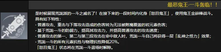 这个技能简而言之就是: 在接下来的一段时间内化身「怒目鬼王」,使用鬼王金碎棒战斗,并获得以下效果: 普通攻击、重击与下落攻击造成的伤害转为无法被附魔覆盖的岩元素伤害; 基于荒泷一斗的防御力,提高其攻击力,并提高普通攻击的攻击速度;普通攻击的第一、第二与第三段攻击在命中敌人时,荒泷一斗自己将获得—层「乱神之怪力」效果; 荒泷—斗的所有元素抗性与物理抗性降低20%;(少有的负提升) 「怒目鬼王」状态将在荒泷一斗退场时解除。 元素爆发倍率(Lv10) 攻击力提高:103.68%防御力 攻击速度提高:10% 持续时间:11s 冷却时间:18s 元素能量:70 大号女仆???由于这个技能开启后可以让荒泷一斗在普通攻击时持续获得「乱神之怪力」效果,所以普通攻击与重击「荒泷逆袈裟」之间如何衔接就显得很重要了。 天赋技能