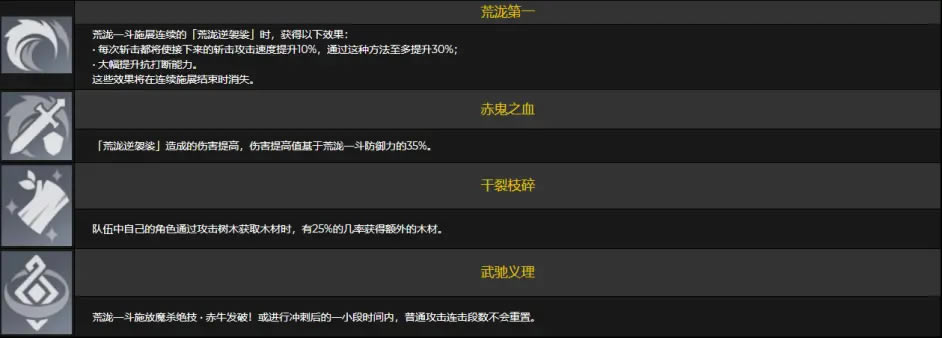 荒泷第一:荒泷—斗施展连续的「荒泷逆袈裟」时,获得以下效果: 每次斩击都将使接下来的斩击攻击速度提升10%,通过这种方法至多提升30%; 大幅提升抗打断能力。 这些效果将在连续施展结束时消失。 提高斩击攻击速度与抗打断能力的天赋,加快了输出频率也算变相提高了伤害与爆发。 赤鬼之血:「荒泷逆袈裟」造成的伤害提高,伤害提高值基于荒泷一斗防御力的35%。 荒泷—斗的元素爆发是根据防御力提高攻击力,而这个天赋是根据防御力提高「荒泷逆袈裟」的伤害,所以防御力对于荒泷—斗来说真的很重要。 干裂枝碎:队伍中自己的角色通过攻击树木获取木材时,有25%的几率获得额外的木材。 原壶玩家狂喜!提瓦特环保协会狂喜!可以砍更少的树获取更多的木材了,尘歌壶也可以更快的堆满了。 武驰义理:荒泷一斗施放魔杀绝技·赤牛发破!(元素战技)或进行冲刺后的一小段时间内,普通攻击连击段数不会重置。 元素爆发时提到过普通攻击与重击衔接问题,而这个天赋可以更好的帮助元素战技与普通攻击之间的衔接,战斗中短暂的冲刺躲避伤害也不会影响普通攻击的正常输出了。