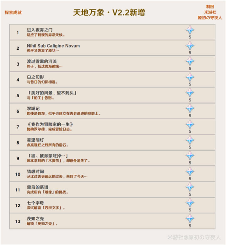 《原神》是由上海米哈游网络科技股份有限公司制作发行的一款开放世界冒险游戏,于2017年1月底立项,原初测试于2019年6月21日开启,再临测试于2020年3月19日开启,启程测试于2020年6月11日开启,PC版技术性开放测试于9月15日开启,公测于2020年9月28日开启。 原神2.2版本增加了许多新的成就,部分玩家可能还不太清楚怎么做,下面一起来看看原神2.2新增成就达成方法汇总吧。 原神2.2新增成就达成方法汇总 本版本新增成就数为31个,总计已经达到530个。 一、天地万象