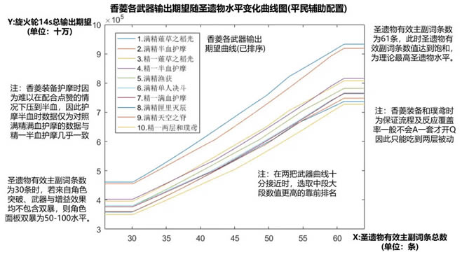 因为是活动赠送武器,所以是白送满精(不出意外还有活动1.5倍升级经验),在入手以及精炼的门槛上已经超越了其他四星长枪了。而输出能力计算的结果也是符合我的预期,在所有四星长枪中支棱了出来,甚至强过了部分五星武器。比如满血精一护摩、满精薄荷和两层被动的精一鸟枪 (经测试,香菱在装备鸟枪时直接对目标开Q能吃到两层被动,先A一套叠满被动再Q的打法会比较大的影响流程和浪费buff)。因此现在还在给香菱用低精的其他四星武器的玩家们可以不用犹豫,直接换取2.1版本钓鱼活动赠送的满精渔获作为香菱的毕业武器使用。除了颜值配色不搭的问题以外,鱼叉这把武器对于香菱来说简直浑身上下都是优点。需要注意的是,绝缘4香菱装备渔获(或者上面的马尾)时,只需要额外的3-5个元素充能效率副词条即可达到200左右的充能,因此马尾/鱼叉香菱使用精通沙是最优选择。如果你实在缺矿不想换武器,或者沙漏位置只有充能沙副词条不错,也可以顺次选择决斗之枪和匣里灭辰等四星长枪进行使用。只要满足香菱拥有180+的充能、50-100以上的双暴、200+的精通就是比较健康的面板了。 接下来是顶级水平的辅助配置下,香菱一轮旋火轮Q输出最高的7种武器(算入精炼为10种): 香菱各武器输出期望随圣遗物水平变化曲线图(顶级辅助配置)