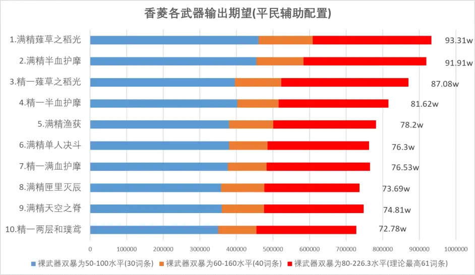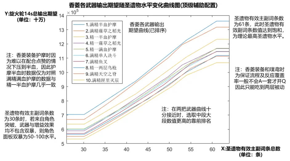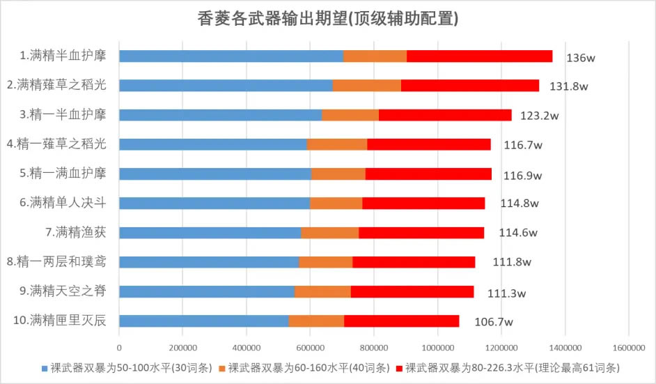 注:上图中的“顶级辅助配置”为6命90级班尼特,武器90级雾切/风鹰,13级Q,圣遗物宗室4;2命90级枫原万叶,武器90级精五苍古,面板精通1152,圣遗物风4;以及一个能保证香菱的反应覆盖率达到75%的水C,例如公子或行秋。香菱圣遗物默认携带绝缘4件套,并始终保证200左右的元素充能效率。同时香菱具有不低于4命的命之座要求,Q技能旋火轮为13级。 结论如图,在携带顶级辅助的队伍中,同等圣遗物水平下输出期望最高的武器是吃到半血被动的满精护摩。因为2命万叶提供的200精通补足了暴伤武器带充能沙后的精通短板,又配合班尼特六命补足了加伤区数值,所以补上了短板的护摩依然非常强。但还是那个问题,香菱没有高效压血的手段,在班尼特Q里很难吃到护摩半血的效果。一旦吃不到,满精护摩的输出就会下跌到精一半血护摩的水平。但即便如此,护摩和马尾依然牢牢占据了前两名的位置。前面在平民辅助配置的结论中提到的马尾被动与香班组合并不契合的问题被放大了,马尾被动只能提供大攻击,但香班组合最不缺攻击力。因此在辅助配置到位后,马尾就从榜首掉下来了。这就导致对于辅助配置接近顶级水平的玩家来说,香菱依然没有一把最契合的满精五星武器。如果鱼叉的被动能够换给马尾那将绝杀,可惜换不得。四星枪中满精单人被动的月卡枪也凭借着和护摩类似的原因支棱了出来,和满精鱼叉的曲线非常接近。最后要点名批评一下雪山薄荷,拿着满精的数据才能被一把四星长枪兜住底,只能说同时踩了香班最不需要的高白和平A附带特效两个坑的下场就是这么惨。至于匣里灭辰,是吃了顶配辅助的条件下精通和加伤的稀释都比较严重的亏。毕竟四星武器的数值模有限,更何况跟它竞争的7把枪都是佼佼者。在2.0版本之前,高精匣里实际上是平民香菱的毕业武器。特别是对于0氪和小月卡党来说,没有月卡枪的情况下,高精匣里是香菱的首选。当然,2.1版本后0氪党们就可以换取满精鱼叉使用了,高精匣里灭辰可以作为胡桃的平民毕业武器继续发光发热。 总结一下,2.1版本的各个新武器实装后,对于平民香菱玩家来说,推荐采取满精渔获+精通沙的搭配,然后是满精决斗+充能沙或满精匣里+充能沙的搭配。对武器池有想法的旅行者可以考虑定轨薙草之稻光进行抽取,进行薙草之稻光+精通沙的搭配,但相较四星武器的提升幅度一般,不必强抽。拥有护摩之杖的玩家如果没有更好的角色使用,也可以进行护摩之杖+充能沙的搭配,但容易浪费武器被动,不是很推荐。对于氪金水平较高的玩家来说,推荐采取满精薙草之稻光+精通沙的搭配。拥有满精护摩的玩家也可以进行满精护摩之杖+充能沙的搭配,虽然容易浪费被动,但总伤害依然能排到前三的水平。如果是缺乏香菱命座的玩家,也可以在雷神池up时捞一捞香菱的命之座,其关键命座为3和4命。
