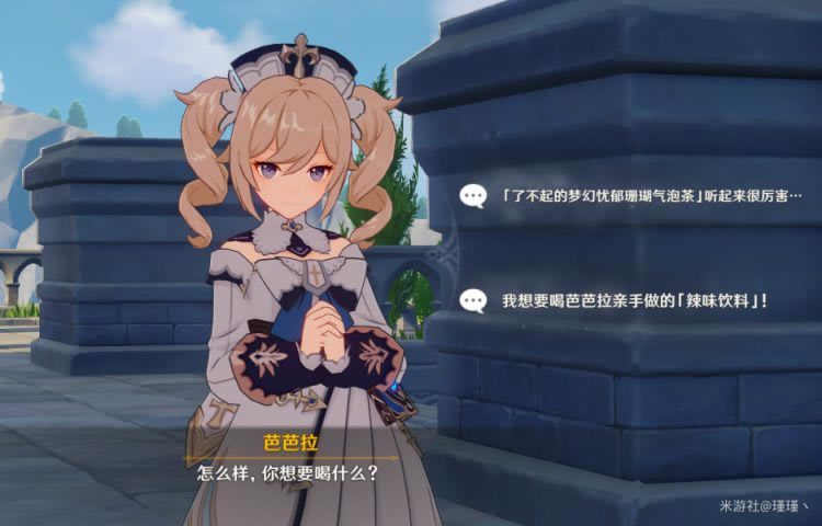 芭芭拉一共是能获得3个成就、1个特殊食物·「辣味时蔬烩肉」和5个结局奖励。 带大家来看下芭芭拉的故事线(一共5条)分别为: ①「坚持不懈」的艾伯特先生 ② 辣辣的饮料 ③ 手制辣味饮料 ④ 心怀叵测之人…? ⑤ 祈礼牧师的闲暇时光 其中成就线是:③/⑤ 紧接着讲解下对话中的重要分支对话: