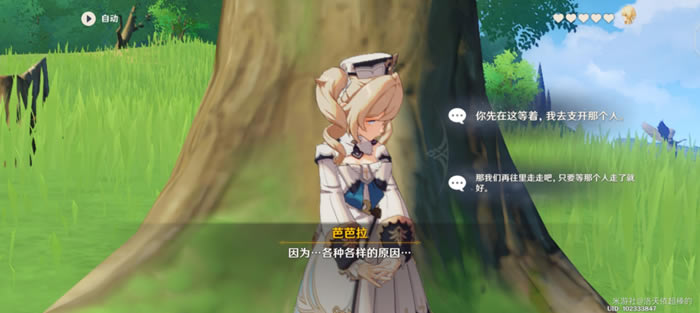 结局一∶不太适时的热情 开启任务后在奔狼领寻找芭芭拉,选项选择【你先在这等着,我去支开那个人】