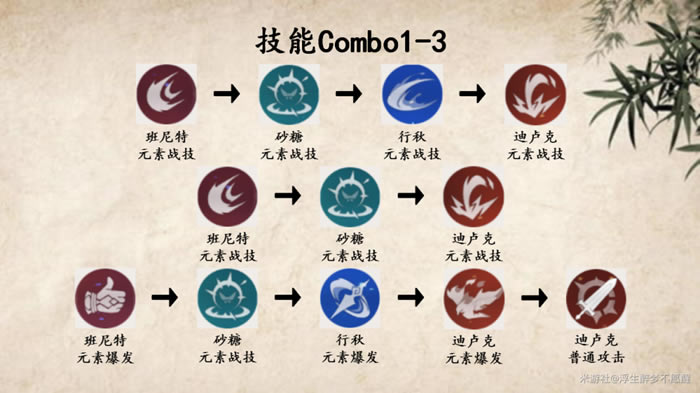 技能Combo为理想输出手法,实战请灵活应对 因为元素战技能取消普攻后摇,行秋和迪卢克元素爆发后普攻时元素附着顺序,以及迪卢克四命效果,技能Combo1-3中的元素战技和普通攻击推荐连招为AEAEAE或AEAAAEAAAE。前者所需时间少,后者伤害总量多,且能使Combo1无缝循环(祭礼剑触发的前提下,未触发可切换Combo2循环)
