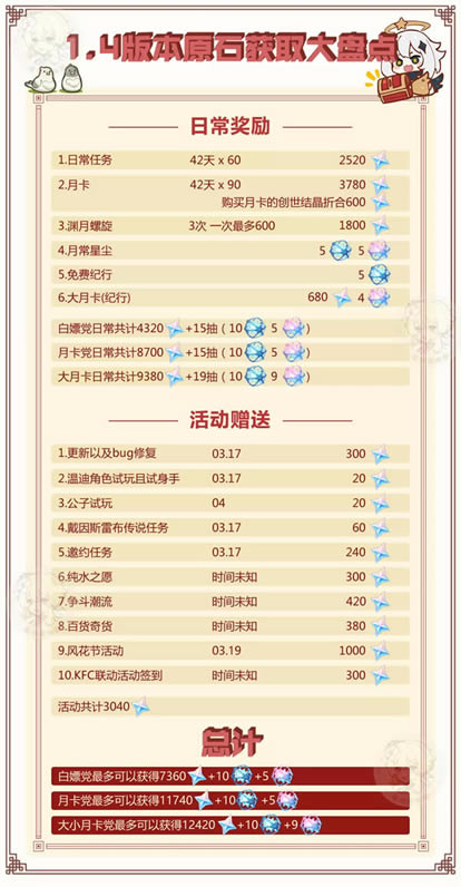 日常部分 统计时深境螺旋按照全部满星来计算,如果有小伙伴无法满星可以根据自身情况减掉对应的数量。 3月的星尘商店大家应该在版本更新前就已经兑换完毕了所以并未计入。图中统计的星尘商店为4月兑换项。 活动部分 活动的计算都是根据以往惯例和版本直播等公开信息推算。这里主要说一下版本活动相关统计的具体来源。 邀约事件(galgame)在1.4版本开放芭芭拉、重云、诺艾尔、班尼特四位角色,在版本直播中我们可以看到每个角色的结局都对应60原石,因此共计240原石。