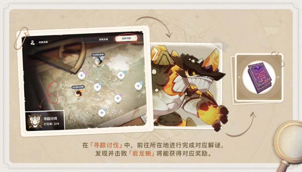 最后还有“寻踪讨伐”活动,和城市声望讨伐类似,到达指定位置完成解谜并击败岩龙蜥即可获得奖励。只不过看这活动介绍,“寻踪讨伐”的奖励好像只有经验书啊,不知道有多少人会放弃这个讨伐活动。