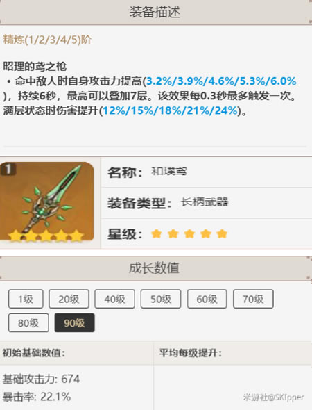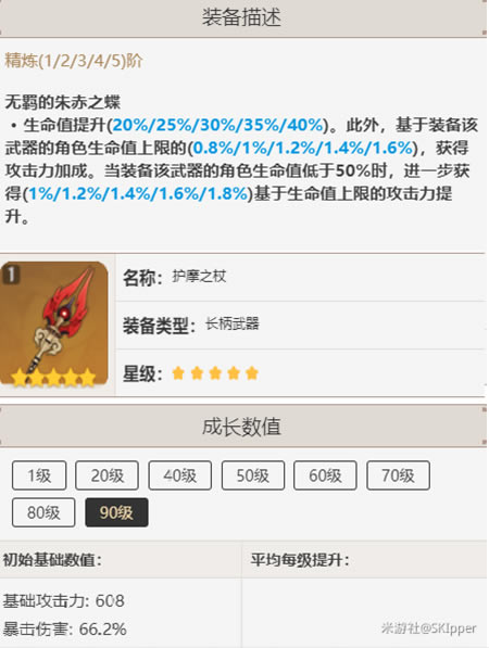 叠满buff的伤害期望为 6594 因为暴击率已经足够了,我们把和璞鸢的暴击率和圣遗物进行调整 变为44%暴击伤害。 它打出的伤害之比未触发50%血量被动的护摩之杖至少那么一丢丢。因为需要叠buff,实战中的感受会比这个稍低一点。 那如果这两把五星武器都没有的话,这里还推荐一把四星武器。 匣里灭辰