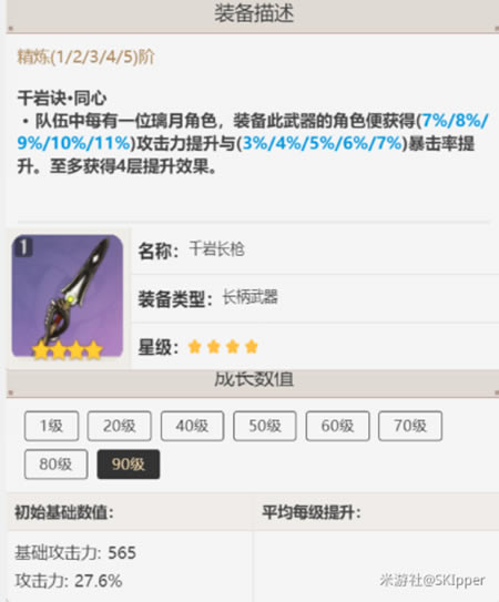 精3的伤害期望是 5641 精5的伤害期望是 5995 这把武器的伤害可以说是在四星武器里面非常高了,哎**乘区就是强啊 考虑到匣里灭辰的元素精通,221的元素精通可以提升39%的蒸发伤害! 这把武器打元素反应的伤害直追护摩之杖 千岩长枪 如果你之前没有抽到护摩之杖的话,那一定歪了很多千岩长枪吧