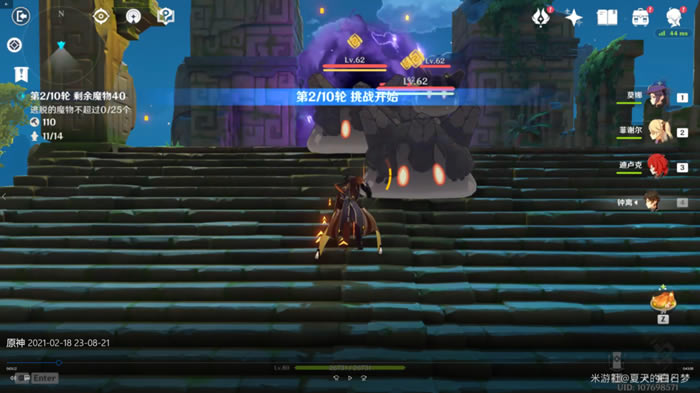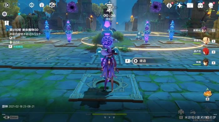 在对局开始的时候,我们选择水系角色,并站在棋局的中后方位置,因为在第1波的时候这里很容易会有火炬丘丘人突破, 所以需要我们用水系角色打感电反应。 只要做好这一点,这一轮就可以很顺利的通关。 在第2轮开始时,我们在两边前侧各补充一个水,然后优先去右边,因为这里很有可能刷新岩史莱姆。这里需要我们提前用角色破除史莱姆的护盾。
