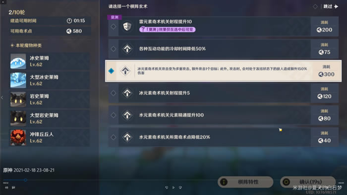 选择他们的原因在于莫娜巴巴拉,可以给敌人附着水元素,配合感电;菲谢尔可以提前或补充雷元素,同时还可以攻击遗迹守卫的弱点使其瘫痪;迪卢克和香菱可以输出火元素破冰史莱姆的护盾;钟离和雷泽可以快速打破岩史莱姆的护盾。 本次棋谭作战将采取的简单流程:前两轮都采用水雷混合打法:第三轮采用水冰雷混合打法:后七轮采用水冰火混合控制流打法:其中需要重点关注的是前三轮和最后一轮。 下面开始战术讲解,在进行第1轮前期搭建时,奇数点会限制在900点,这时我们需要两个道路前,各放置一水一雷,(这里推荐水放在道路的两侧道路中间范围),然后道路中后方放一个雷然后可以选择在其中一边放置发财树(回收机关)如图下。