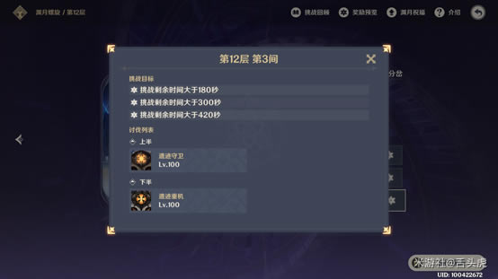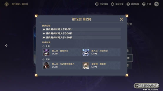 【12-2】 小总结: 12-1能过,12-2应该不会有问题;脚底有圈的怪物身上有buff。 》上半: 怪物:雷(带buff)、冰荧术士。 注意:打冰术士要带火破盾;雷术士有buff,建议先雷。 建议:带火;先雷。 》下半: 怪物:债务人x2、盗宝团x2。 注意:债务人火抗高,用火c打时,建议带风or钟离减抗。债务人伤害较高,隐身技能相对恶心。 建议:争对隐身可用刻晴、钟离、莫娜、香菱等无指向大范围技能角色破解。