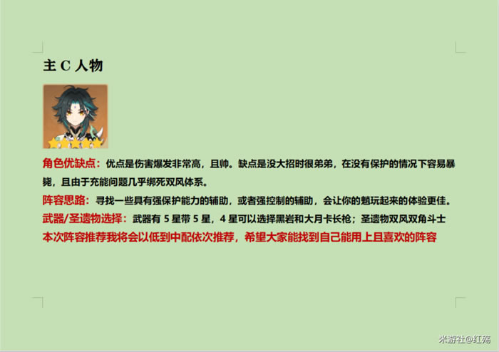 角色优缺点:优点是伤害爆发非常高,且帅。缺点是没大招时很弟弟,在没有保护的情况下容易暴毙,且由于充能问题几乎绑死双风体系。 阵容思路:寻找一些具有强保护能力的辅助,或者强控制的辅助,会让你的魈玩起来的体验更佳。 武器/圣遗物选择:武器有5星带5星,4星可以选择黑岩和大月卡长枪;圣遗物双风双角斗士 本次阵容推荐我将会以低到中配依次推荐,希望大家能找到自己能用上且喜欢的阵容 低配:魈 风主 芭芭拉 凯亚