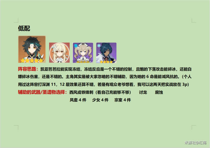 阵容思路:凯亚芭芭拉能实现冻结,冻结反应是一个不错的控制,且魈的下落攻击能碎冰,还能白嫖碎冰伤害,还是不错的。主角其实是被大家忽略的不错辅助,因为她的6命是能减风抗的。(个人用过这阵容打深渊11,12层效果还算不错,若是有观众老爷想看,我可以这两天把实战放在3p) 辅助的武器/圣遗物选择:西风或铁锋刺(看自己充能够不够) 讨龙 腐殖 风套4件 少女4件 宗室4件 中配:魈 砂糖 班尼特 行秋