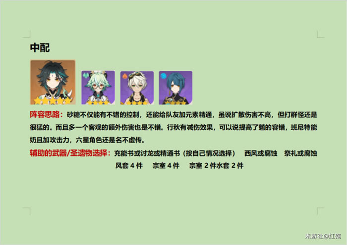 阵容思路:砂糖不仅能有不错的控制,还能给队友加元素精通,虽说扩散伤害不高,但打群怪还是很猛的。而且多一个客观的额外伤害也是不错。行秋有减伤效果,可以说提高了魈的容错,班尼特能奶且加攻击力,六星角色还是名不虚传。 辅助的武器/圣遗物选择:充能书或讨龙或精通书(按自己情况选择) 西风或腐蚀 祭礼或腐蚀 风套4件 宗室4件 宗室2件水套2件 高配:魈 温迪 班尼特 钟离