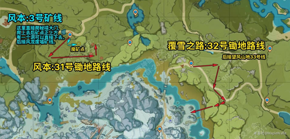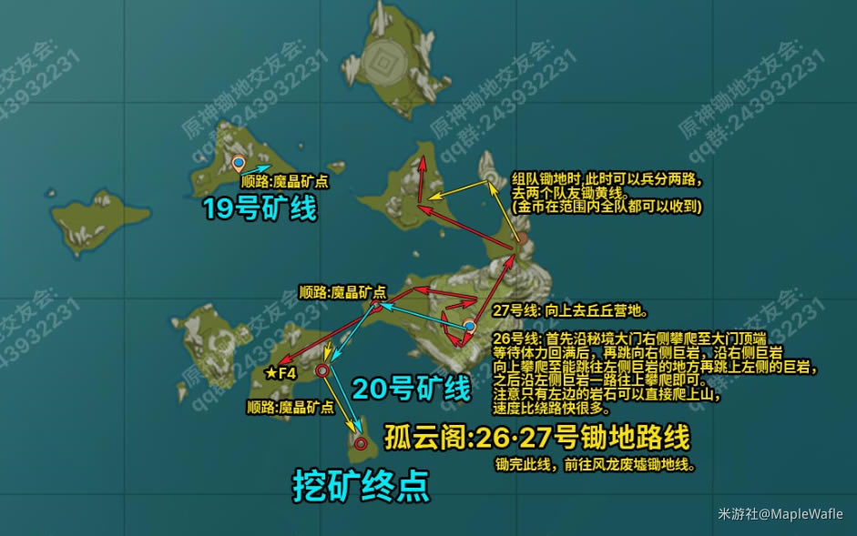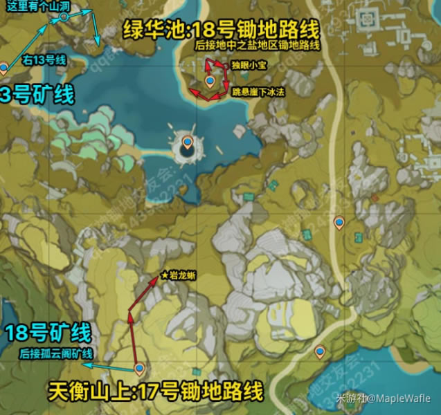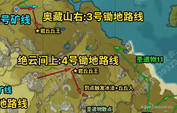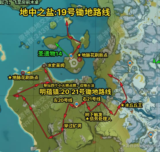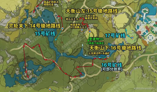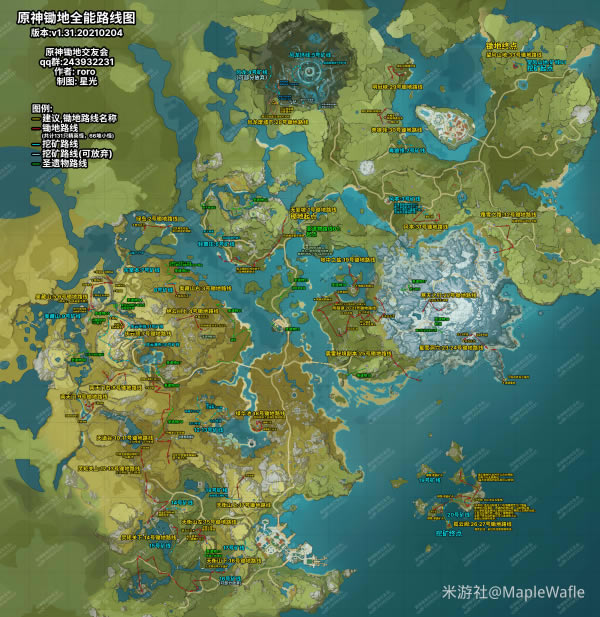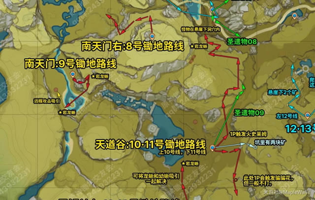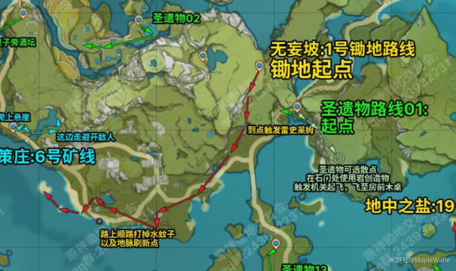 一点点心得: 1. 锄大地不是随便刷怪的 锄大地不是乱锄的,并不是怪越多越好。锄大地的主要收入来自精英怪掉落的圣遗物和金币。圣遗物只有精英怪才掉,而每个人每天最多锄 400 个精英怪就到上限了。 什么是上限? 当你发现打死大怪即不掉金币也不给经验就到上限了,小怪掉落仍然正常。 2. 锄地需要的是受益和效率平衡 所以这也是为什么锄地不要打骗骗花和愚人众的原因,收益极低还浪费时间,还占了你一个精英怪位置。时间上不建议太久,锄 3-4 个世界达到上限最佳。 路线拆分图