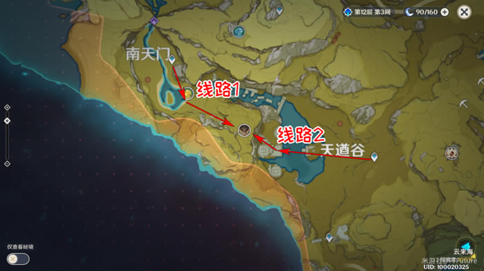 根据对话得知,协会这段时间经常会接到南天门到天遒谷一带的地震报告,一次比一次严重,甚至造成了部分山体和遗迹的坍塌,似乎还出现了曾经的魔物,于是这位冒险家的调查员想拜托我们去看看情况,以便制定对策。 1. 前往天遒谷的遗迹空洞 频繁地震造成的遗迹空洞,就位于天遒谷和南天门之间,各位旅行者可以选择传送到南天门或天遒谷后前往,路线1或路线2任选其一即可(这里推荐路线1,个人尝试路线1会比较快,路线2中间需要游泳,比较耽误时间),具体位置及路线如下图所示。