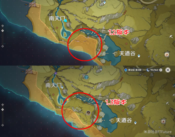 ▲遗迹空洞位置及路线 来到任务区域,一个巨大的空洞映入眼帘,从新旧两个版本地图的对比也可以看到,天遒谷与南天门之间新解锁了一块区域,这块区域就是1.3版本新增的首领怪物「古岩龙蜥」的刷新位置。