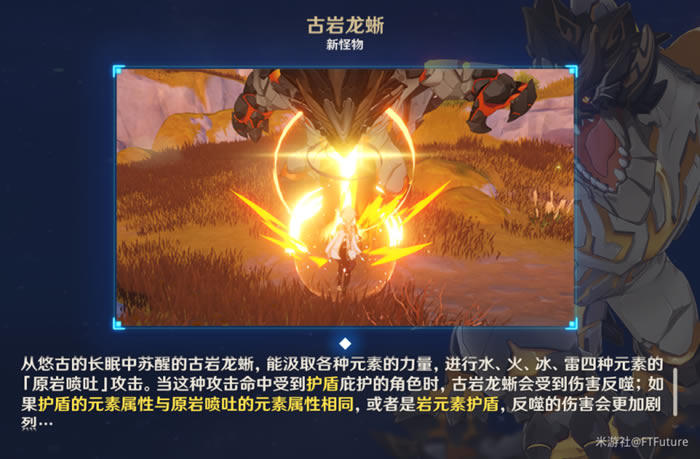 ▲古岩龙蜥 古岩龙蜥具有四种属性,分别是火、冰、水、雷,其属性是在战斗前就决定好的,战斗过程中不会变换其他属性,战斗结束后除了其本身会掉落的岩元素突破素材以外,还会根据这个属性掉落火、冰、水、雷属性突破素材。(例如上图中的是水属性的古岩龙蜥,则将其击败后除了掉落岩元素突破素材以外,还会掉落水元素的突破素材) 古岩龙蜥主要有挥拳、砸地、甩尾、潜行、原岩喷吐等多种攻击手段。虽然攻击本身的伤害比较高,但由于其身形庞大,攻击速度也并不快,因此都比较容易躲避,这里就只重点强调一下古岩龙蜥的“原岩喷吐”技能。 古岩龙蜥使用“原岩喷吐”时,会根据其当前的元素属性对自身周围释放一次高伤害的范围冲击波。虽然这个攻击的伤害很高,但只要命中了带有护盾的角色,就会对古岩龙蜥自身造成反噬。在此基础上,若是玩家使用了与其相同元素属性的护盾,或者万能的岩元素护盾,反噬的伤害还会进一步增加。
