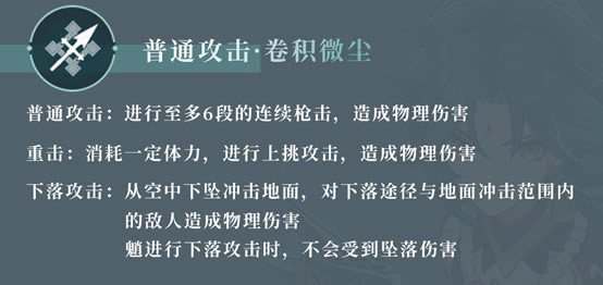 魈的普通攻击为至多六段的小范围攻击,总伤害倍率在目前长枪角色中排名最高。 重击不同于其他长枪角色,不会向前突进,且能够挑飞敌人,倍率处于中流地位。 下落攻击冲击伤害在长枪角色中倍率排名最高(打桩机的由来),下落攻击有低空/高空两种落地冲击伤害,落地冲击伤害倍率高空>低空,开启元素爆发后魈跳跃能力会被强化,可以轻松打出高空冲击伤害。 在不开启大招的情况下,不推荐魈使用以上攻击方式进行输出。 元素战技