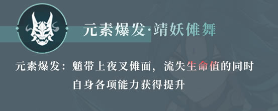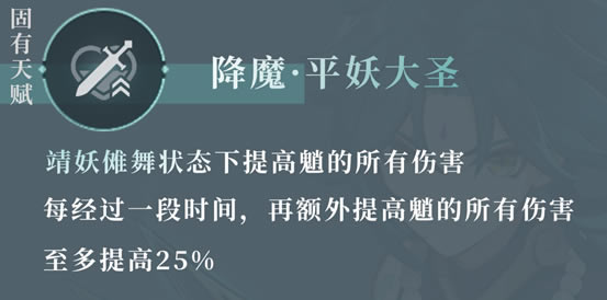 元素能量:70 持续时间:15S 冷却时间:18S 魈带上数千年前的令神魔精妖睹之胆颤的夜叉傩面,引导出巨大痛苦的同时自身实力获得巨大提升。具体表现在: ◎跳跃能力大幅度提升 ◎普通攻击/重击/下落攻击伤害大幅度提升、攻击范围变大且转换为不可被元素附魔覆盖的风元素伤害。(攻击范围的提升幅度大概在10%~20%之间) ◎每秒流失基于当前生命值最大百分比的血量。 PS:其中跳跃能力不会随着天赋提高而跳的更高,普通攻击/重击/下落攻击的提升幅度会随着元素爆发天赋等级的提高而提高,每秒流失的血量随着等级的提升而减少,在7级时达到最低:每秒流失当前2%的生命值。 「元素爆发·靖妖傩舞」开启所需能量为70,相对于其他输出角色来说所需能量较多。且处于靖妖傩舞状态时,魈释放元素战技击中敌人无法产生风元素微粒。因此魈若不处于双风队伍中,推荐在圣遗物副词缀伤堆叠一些元素充能效率。 输出方式上,未满命以打桩机为主,即:跳→下落攻击→跳→下落攻击…. (有效攻击大概为11次左右) 考虑到固有天赋的加成,元素爆发期间,若元素战技有使用次数时且充能次数未满时,尽量迟一些释放元素战技。 开启元素爆发前要做好防暴死/脱手治疗领域的措施,比如班尼特的大招/琴的大招/钟离的护盾等等。大致原因有以下两点: ◎靖妖傩舞状态持续流失生命值 ◎长枪角色的打断力不如大剑角色,有时无法打断怪物的一些高韧性高伤害动作 固有天赋 「降魔·平妖大圣」