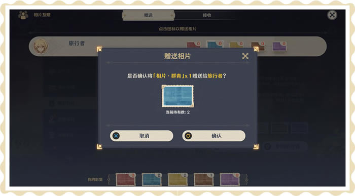 在活动页面找到相片互赠,在赠送页签点击对方的相片图标,即可赠送对应的相片。在接收页签可以领取他人赠与的相片。 不过需要注意的是,2月11日 03:59~2月13日 03:59,「奇特的『留影机』」将无法再进行拍摄,旅行者将无法通过拍摄获得相片,但仍可与好友互赠已有的相片,集齐相片后依旧可以进行奖励兑换。 旅行者最多可以保留50张未领取的相片。未领取的相片超过50张时,会依照相片获得顺序,将较早获赠但尚未领取的相片销毁。活动结束后,收集的相片也将会被回收。 活动结束后,可在季同处完成世界任务「完美留影」,可以获取小道具「特制的『留影机』」 使用「特制的『留影机』」拍出来的相片会附带特殊的色彩。