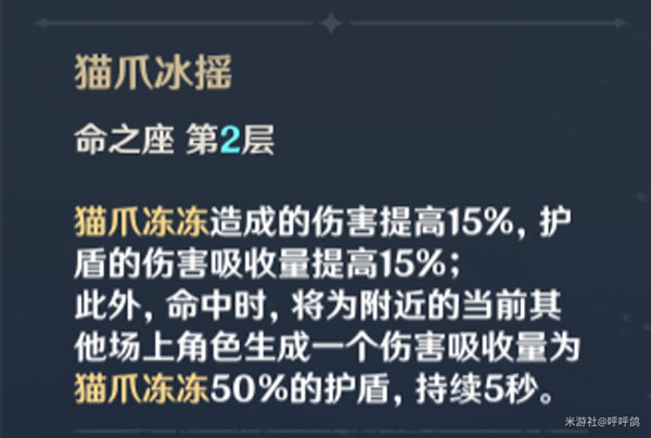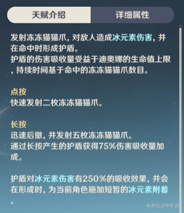 元素战技:猫爪冻冻 迪奥娜的核心技能,冻冻猫爪命中后会给自身形成护盾(注:需命中后才会生成护盾)。 点按将“快速”发射两发,长按会先后撤并发射五发并提高护盾吸收量。 护盾的持续时间是根据猫爪命中数来计算,且提升天赋等级会增加持续时间(每级增加每个猫爪0.1s的持续时间)。所以,为了护盾量和护盾的持续时间,猫爪冻冻也是迪奥娜主点的技能。 PS:因为形成的护盾对冰属性伤害有250%的吸收量,所以在改版之前的深渊12层有很好的表现。