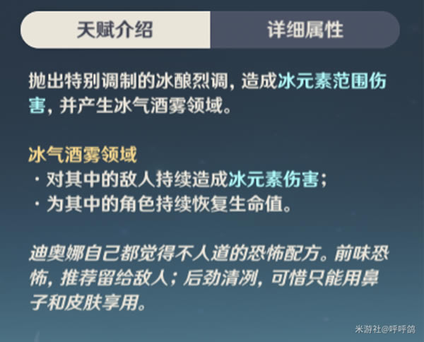 元素爆发:最烈特调 核心效果:为其中角色持续恢复生命值的同时对其中的敌人持续造成冰伤 迪奥娜的奶量和挂冰增伤的依凭。