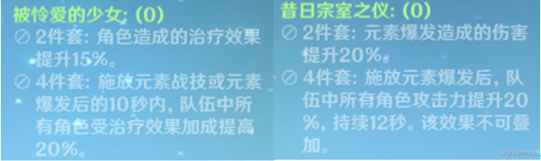 介绍完技能之后各位看官应该就已经大致了解迪奥娜的一个技能机制,相比于战斗天赋,迪奥娜的固有天赋“猫尾隐藏菜单”和“滑稽百出的醉相”就显得有些鸡肋。具体技能效果可以看游戏内的介绍,蚊子腿也是肉。 圣遗物推荐 “被怜爱的少女”4件套、“昔日宗室之仪”4件套 在队伍需要奶量支持或高压环境中,建议少女4件套提供更多奶量以增加队伍的容错率。 在队伍攻略速通时,可选择宗室4件套增加队伍爆发伤害。 具体圣遗物看个人使用习惯,若队伍搭配奶妈且没有其他人携带宗室4件套的情况下,建议携带宗室4件套。若队伍没有搭配其他奶妈,加血任务承担到迪奥娜身上时,带少女4件套增加奶量,提高队伍容错性。 圣遗物词条选择:治疗加成头部 + 生命值时之沙 + 生命值杯子,副词条优先元素充能与生命值。
