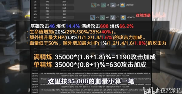 好家伙,这就是春节档的五星武器吗。 这里按35,000的血量小算一笔,在血量低于50%的情况下,那单精炼就是630的攻击加成 满精炼是1190,光看数值提升还是蛮大的