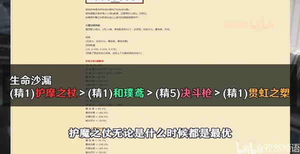 还有就是论坛上已经有大佬做了这个数据对比,我大致看了一下胡桃说一下结论吧。 ·护魔之仗无论是什么时候都是最优,不愧是专五 ·精炼5的决斗枪,比精炼1的 贯虹之槊略胜一筹