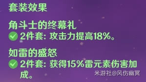 毕业套是角斗士2+骑士道2 时之沙:攻击力、空之杯、物伤>攻击力>雷伤、理之冠:爆伤。 副C 上雷工具人,在队伍中出来放只鸟就可以回去了。优先升级E技能。