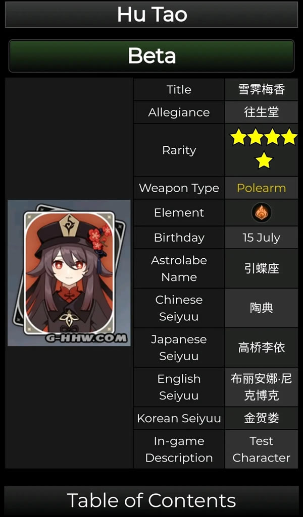 《原神》是由上海米哈游网络科技股份有限公司制作发行的一款开放世界冒险游戏,于2017年1月底立项,原初测试于2019年6月21日开启,再临测试于2020年3月19日开启,启程测试于2020年6月11日开启,PC版技术性开放测试于9月15日开启,公测于2020年9月28日开启。 原神胡桃是一个火属性长枪角色,部分玩家可能对其突破材料、技能、命之座以及天赋材料还不是很了解,下面一起来看看原神胡桃详解吧。 原神胡桃详解 这里是胡桃的cv