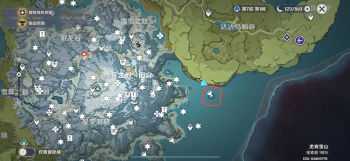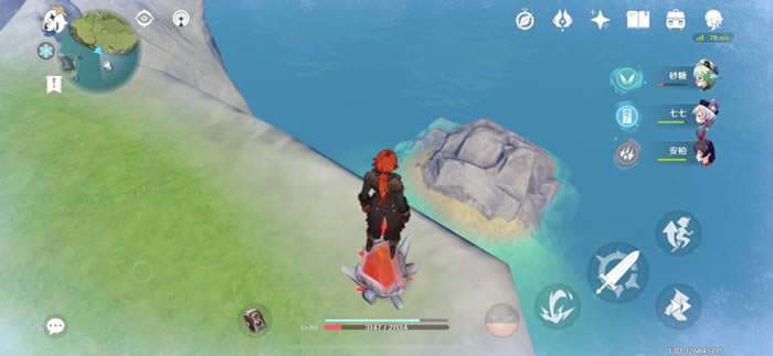 如图所示,但是附近没有深红就很难搞,第一次试了半小时没解决,左上方那个小小岛有个深红石,后来我是用公子和七七,打掉石头后开始铺冰,到中途看见封印石的时候公子用箭射,才解开,废了很大事。 接下来是重点!!敲黑板 今天闲逛,发现这个位置有一颗深红石,下边就是有封印的小岛了,只不过走路有点远,但是绝对是目前最省事,也是简单拿到这个绯红的办法了
