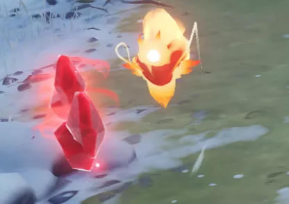 挑战方式为护送(无敌的)温暖仙灵,在挑战起始点会有1个温暖仙灵,开启挑战后会进入暴风雪天气,倘若不围绕着温暖仙灵进行战斗,严寒值会快速累积。 怪物数量配置由3个(愚人众)或6~8个(史莱姆、丘丘人、盗宝团、骗骗花)组成,强度与大世界等级相一致,无较大难点。(愚人众配置本人只遇到过火枪、冰胖、风拳和岩法,雷锤和水胖没有出现过,仅供参考)。 在挑战过程中,温暖仙灵的周围会不断掉落深赤之石,拾取后可使严寒值停止累加并使下一次攻击附带火元素伤害,增加输出。