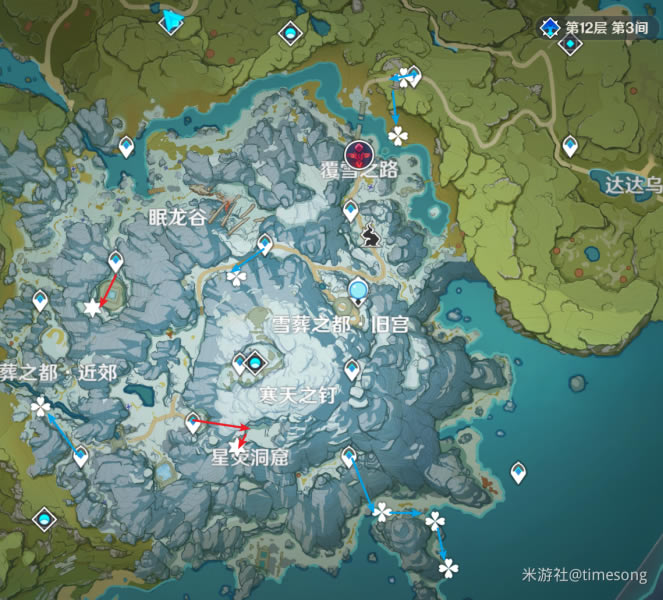 (圣遗物24h刷新) 1.雪山 (星标为圣遗物每日刷新点位) (四叶草为一次性圣遗物点位)