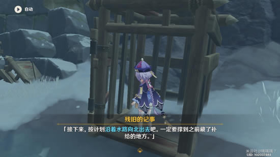 囚牢打开,发现「残旧记事·一」 某人曾被仇敌关押于此,但他终究打开了牢笼,沿着水路开始逃亡。仇敌非常强大,在他被砍伤的伤口中,仍然残留着敌人的元素力量。