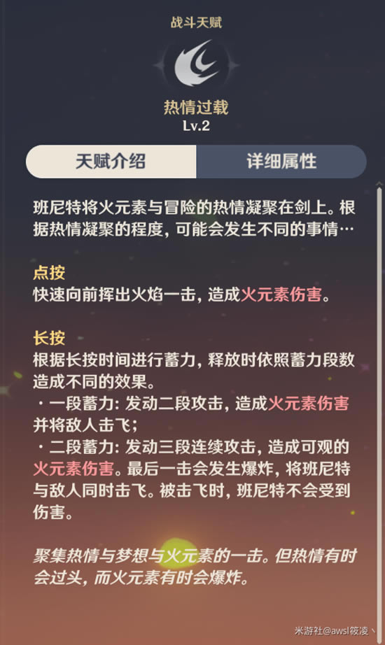 四命:热情不灭 释放一段蓄力的热情过载时,在技能第二阶段中进行普通攻击,可以释放额外的追击。 追击的伤害等同于第二段攻击的135%。 这命就相当于在班尼特大招里不会被自身击飞了一样但是伤害比二段蓄力低一丢丢