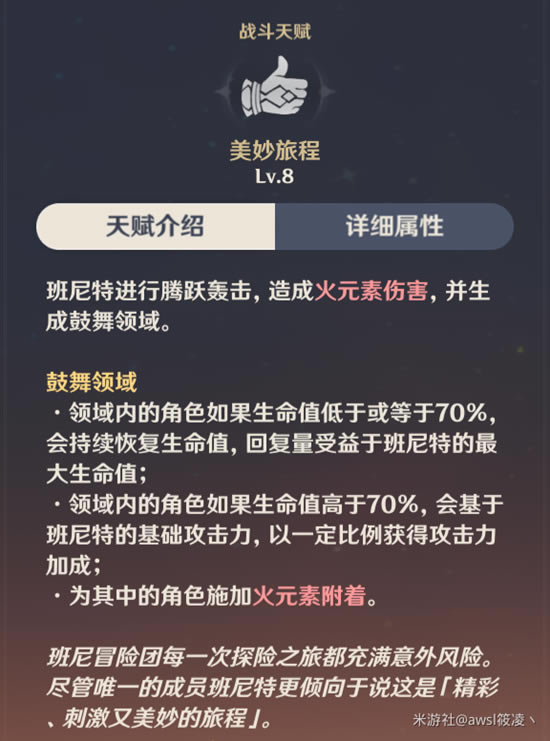一命:冒险憧憬 美妙旅程的攻击力提升效果不再有生命值限制,数值上追加班尼特基础攻击力的20%,有很多人就在想是不是一命了就可以奶满了?答案是NO! 实际效果是:q技能范围内,血量低于70%以下会继续回血,直到血量超过70%,但是70%以下可以享受攻击力加成,之前是不享受的
