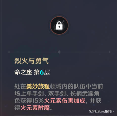 第六命:烈火与勇气 处在美妙旅程领域内的队伍中当前场上单手剑、双手剑、长柄武器角色获得15%火元素伤害加成,并获得火元素附魔。 这命给大招内的近战武器的普通攻击变成火属性伤害,效果类似重云,并给角色15火元素伤害,这一命虽然也是提升伤害的但是对于大多数角色来说没什么用,甚至对于有些角色来说是。